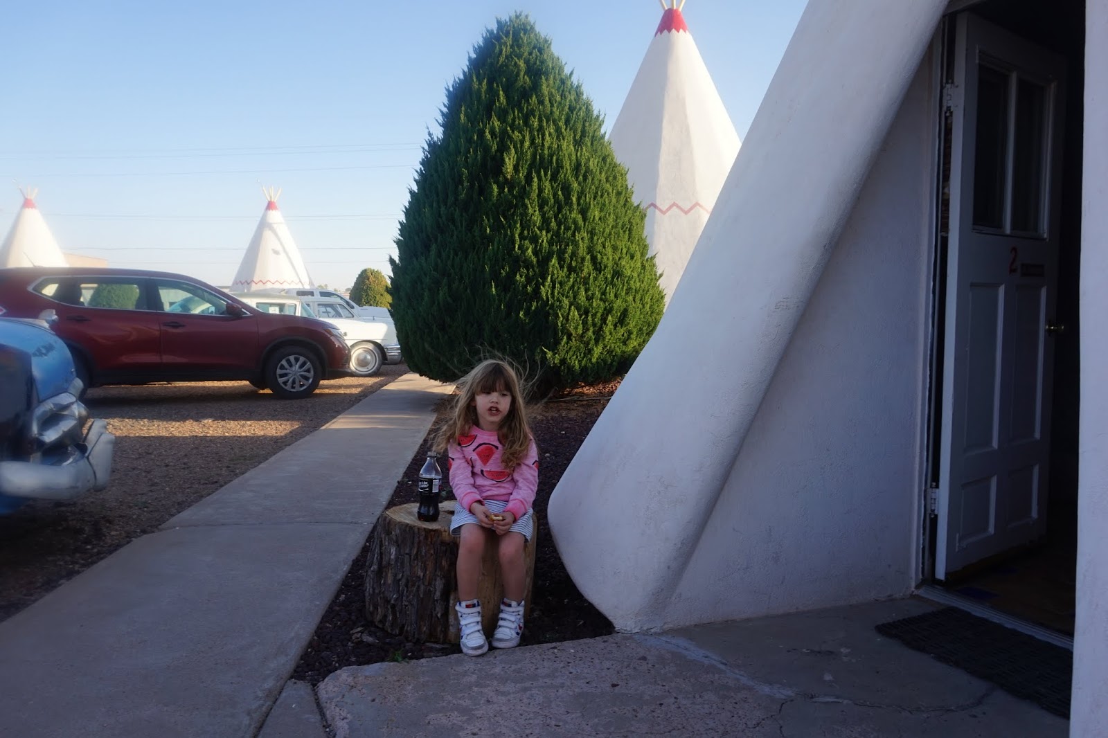 Holbrook, Arizona is home to another iconic motel, The WigWam Motel. Petteke was so happy we were going to sleep in a teepee, but did not really understand we would not need a sleeping bag and that there was going to be a toilet in the wigwam. It was a warm day and after a few hours in the car we were ready for some family fun. The girl at the motel office told us there was a splash pad a few blocks down the road, so off we went. Olivia had such a good time running from the water mostly and Lolo practiced his baseball and golf skills. After we did a little apero in front of our wigwam and went to dinner, before turning in for the night. Olivia loved it, and wanted to stay for another couple of days , but we had to hit the road again. Grand Canyon here we come again, this time with a kid!